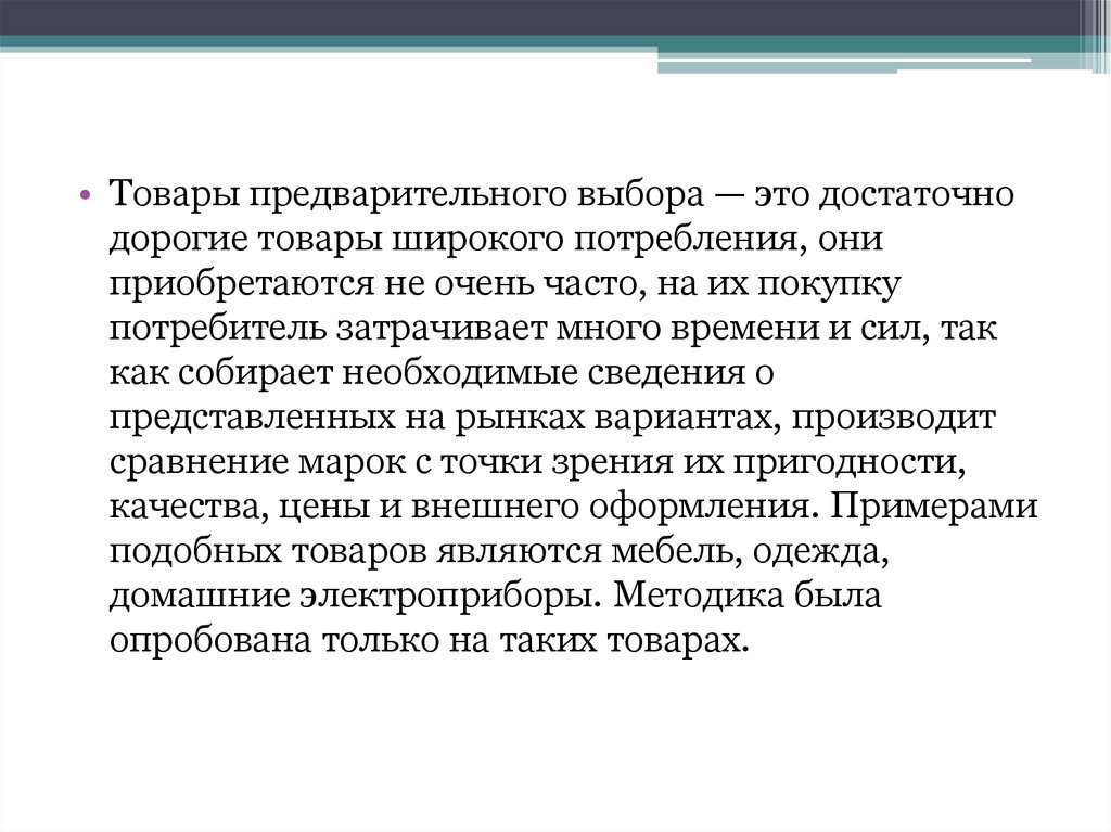 • Товары предварительного выбора — это достаточнодорогие товары широкого потребления, они