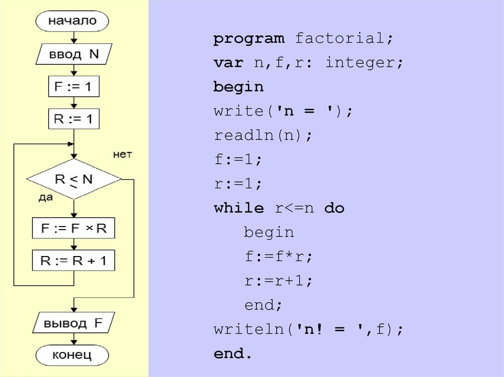 program factorial;var n,f,r: integer;