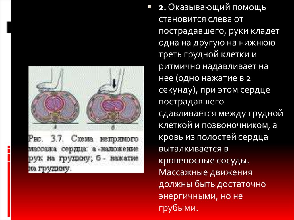 5. Если около пострадавшего находится один человек, онпроизводит искусственное дыхание и массаж в