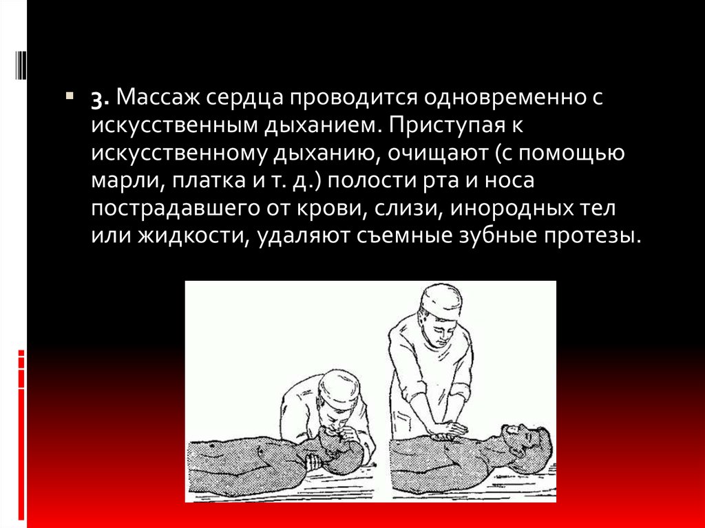 3. Массаж сердца проводится одновременно сискусственным дыханием. Приступая к