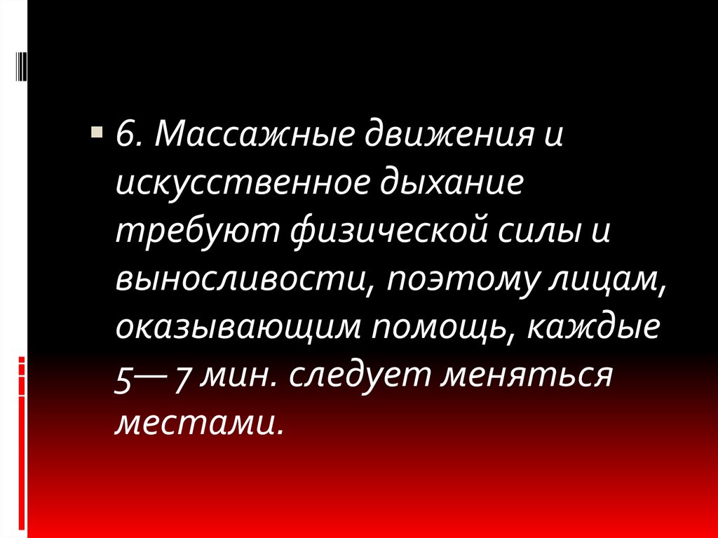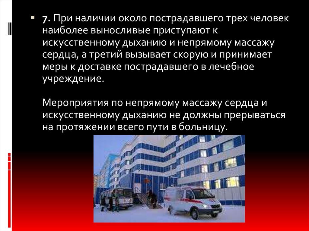 7. При наличии около пострадавшего трех человекнаиболее выносливые приступают к