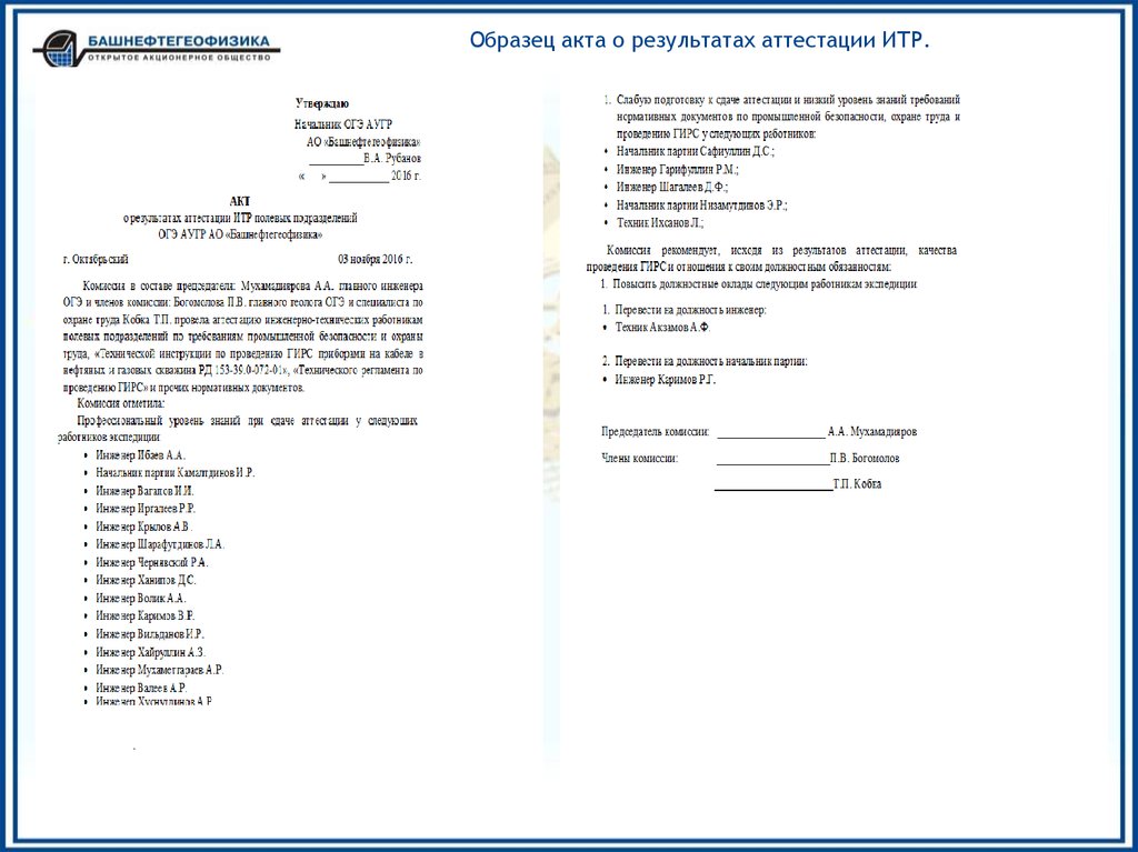 По окончании аттестации составляется акт о результатах аттестации ИТР,
