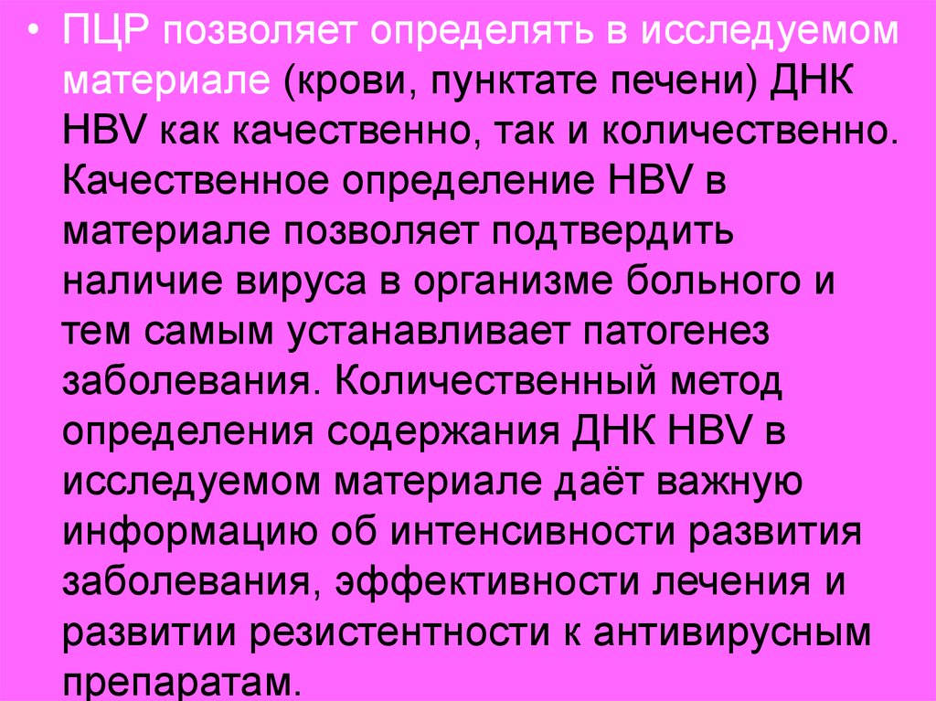 • ПЦР позволяет определять в исследуемомматериале (крови, пунктате печени) ДНК