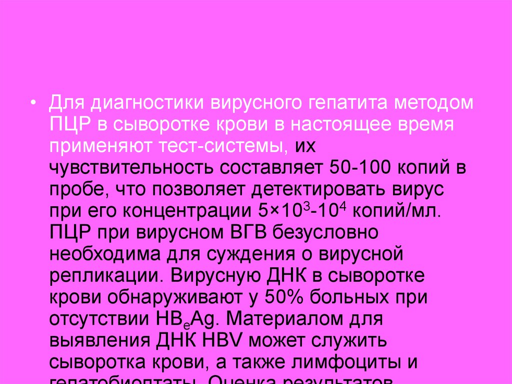 • Для диагностики вирусного гепатита методомПЦР в сыворотке крови в настоящее время