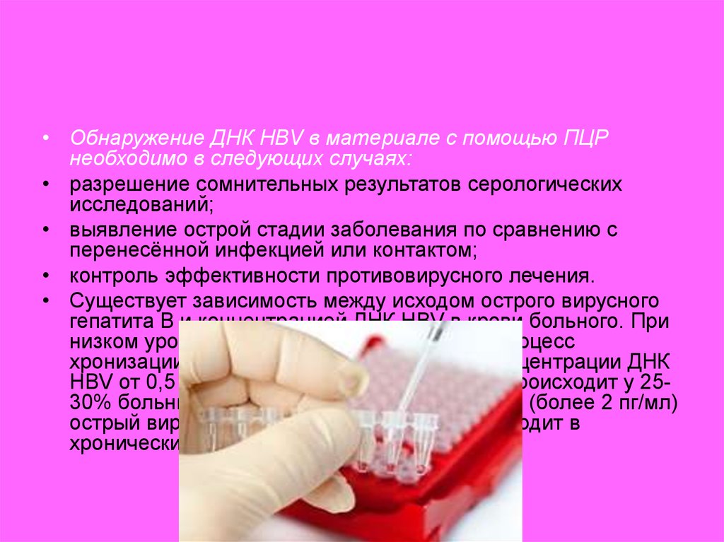 • Обнаружение ДНК HBV в материале с помощью ПЦРнеобходимо в следующих случаях:
