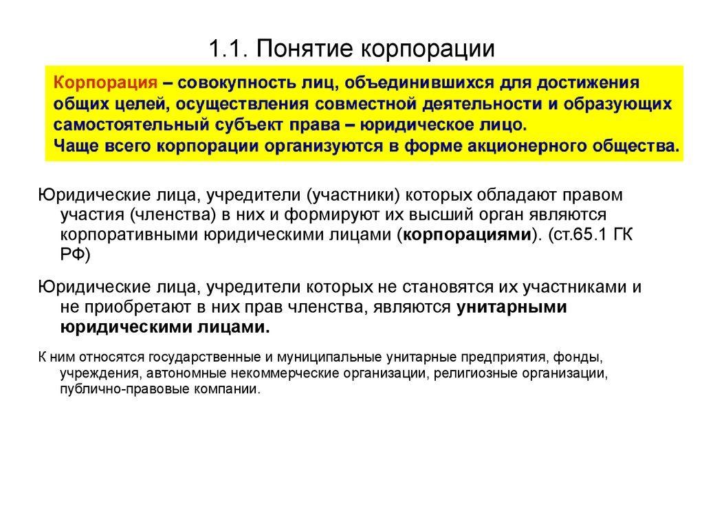 1.1. Понятие корпорацииЮридические лица, учредители (участники) которых обладают правом