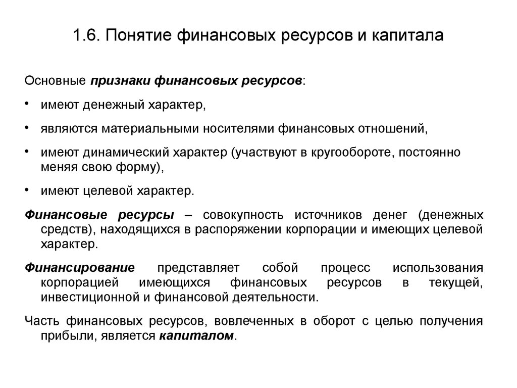 1.6. Понятие финансовых ресурсов и капиталаОсновные признаки финансовых ресурсов: