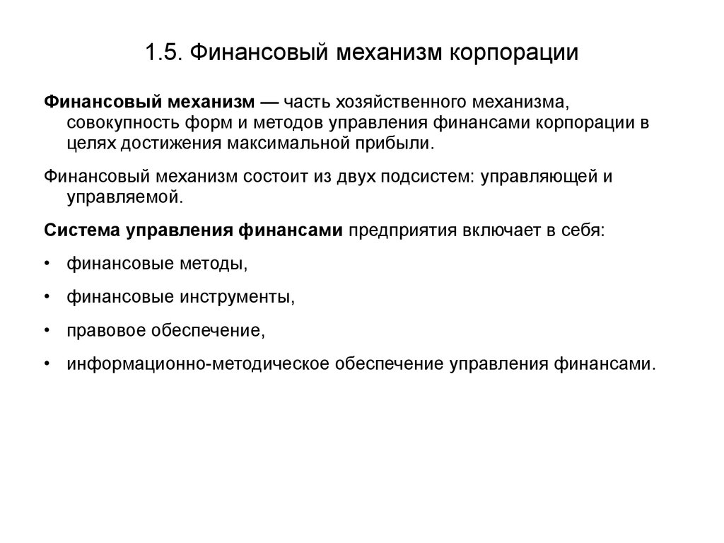 1.5. Финансовый механизм корпорацииФинансовый механизм — часть хозяйственного механизма,