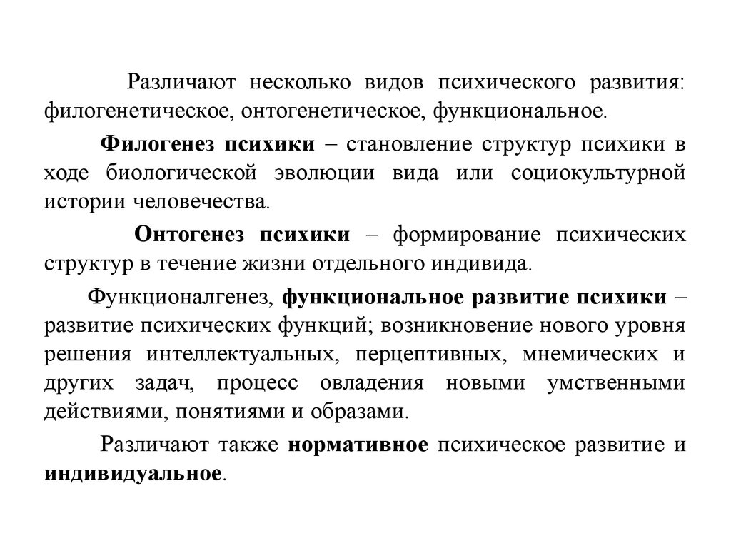 Различают несколько видов психического развития:филогенетическое, онтогенетическое, функциональное.