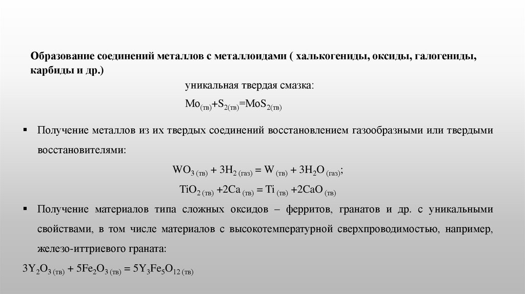 Образование соединений металлов с металлоидами ( халькогениды, оксиды, галогениды,карбиды и др.)