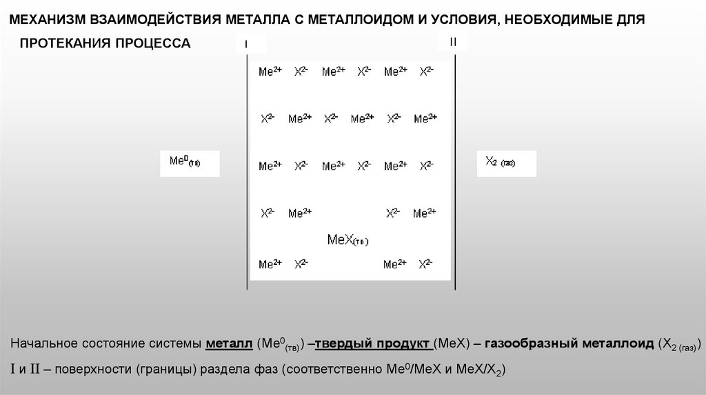 I и II – поверхности (границы) раздела фаз (соответственно Ме0/МеХ и МеХ/Х2)