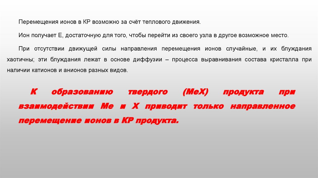 Перемещения ионов в КР возможно за счёт теплового движения.Ион получает Е, достаточную для того, чтобы перейти из своего узла в другое возможное место.