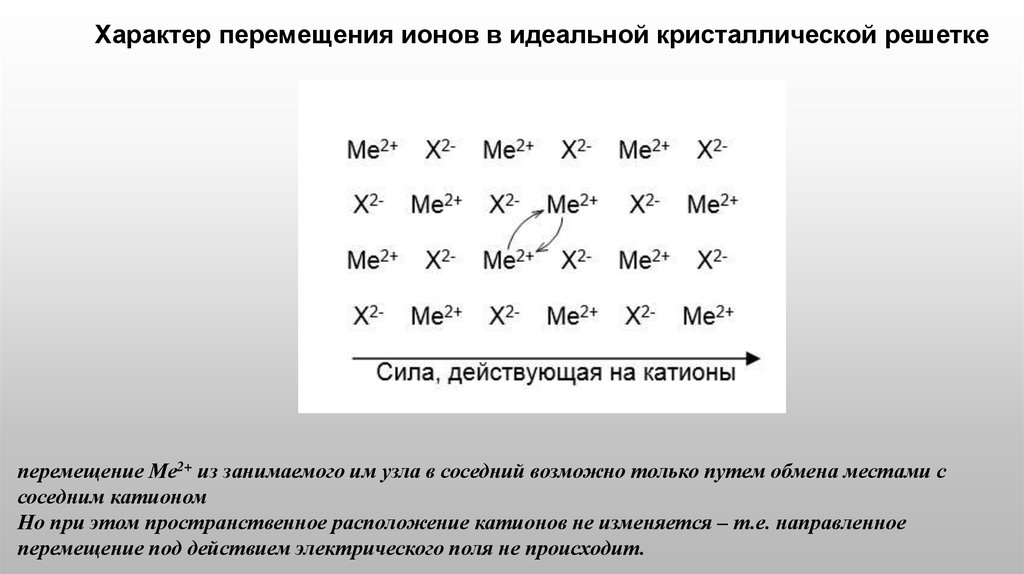 Характер перемещения ионов в идеальной кристаллической решеткеперемещение Ме2+ из занимаемого им узла в соседний возможно только путем обмена местами с