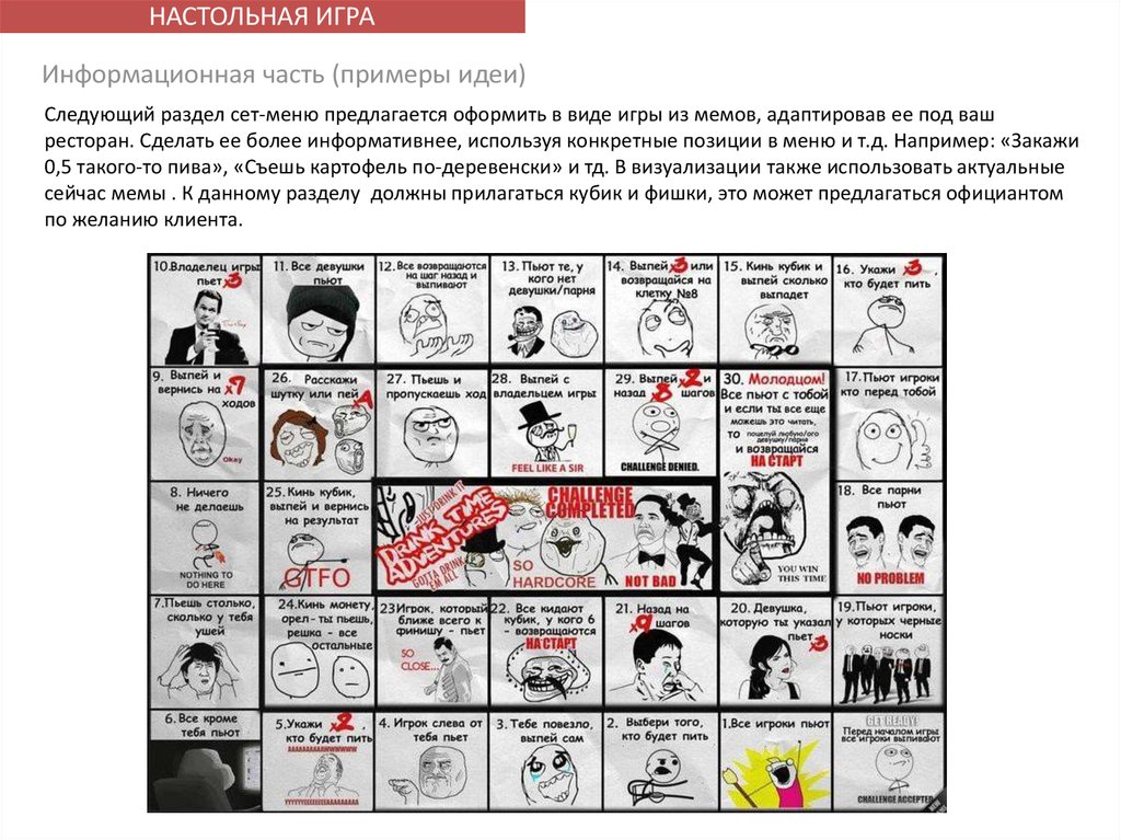 сейчас мемы . К данному разделу должны прилагаться кубик и фишки, это может предлагаться официантом