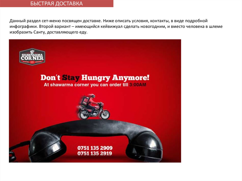 ресторан. Сделать ее более информативнее, используя конкретные позиции в меню и т.д. Например: «Закажи