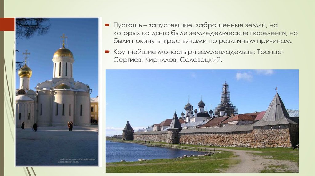Крупнейшие монастыри землевладельцы: ТроицеСергиев, Кириллов, Соловецкий.