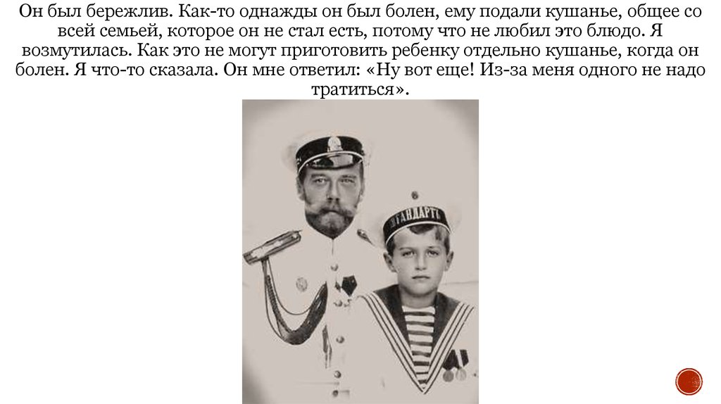 Он был бережлив. Как-то однажды он был болен, ему подали кушанье, общее совсей семьей, которое он не стал есть, потому что не любил это блюдо. Я