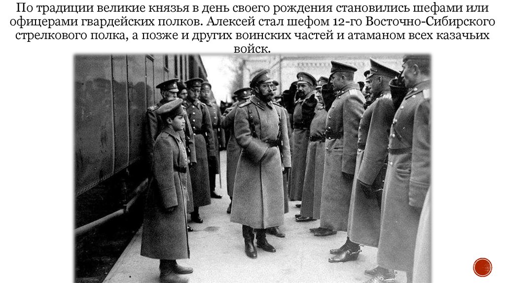 По традиции великие князья в день своего рождения становились шефами илиофицерами гвардейских полков. Алексей стал шефом 12-го Восточно-Сибирского