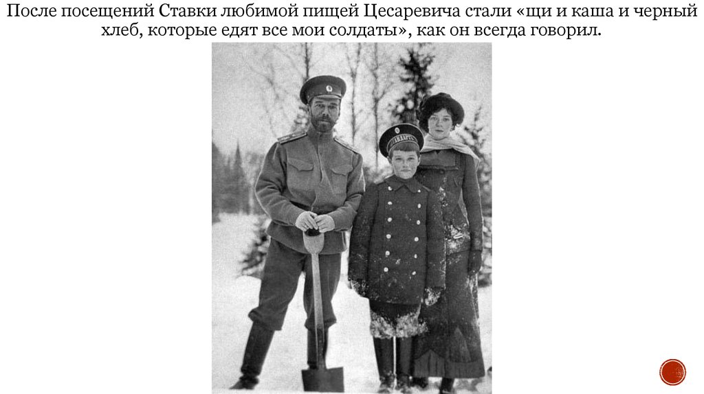После посещений Ставки любимой пищей Цесаревича стали «щи и каша и черныйхлеб, которые едят все мои солдаты», как он всегда говорил.