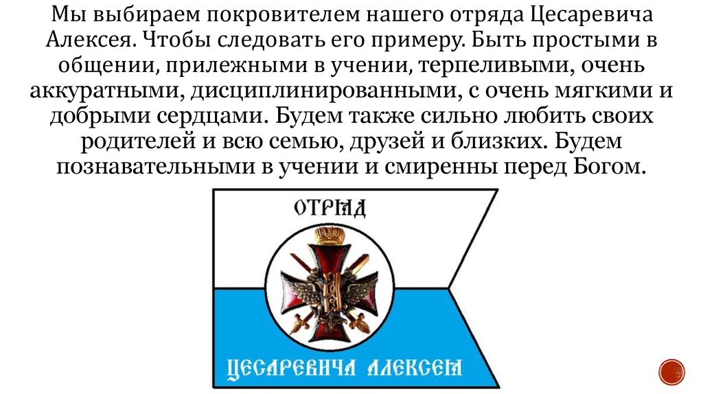 Мы выбираем покровителем нашего отряда ЦесаревичаАлексея. Чтобы следовать его примеру. Быть простыми в