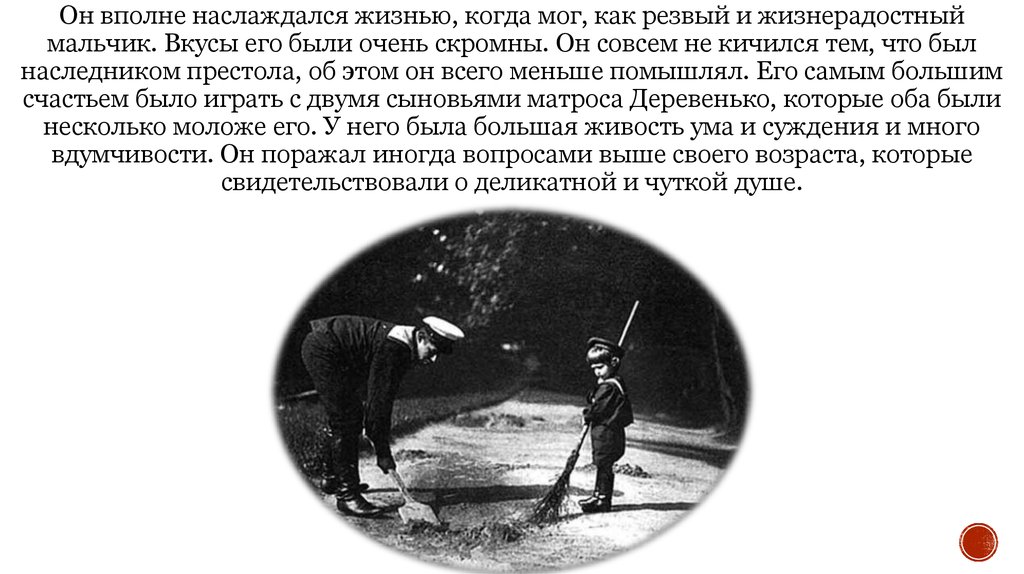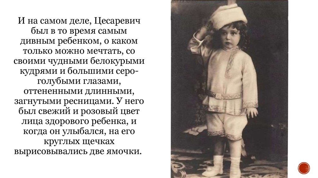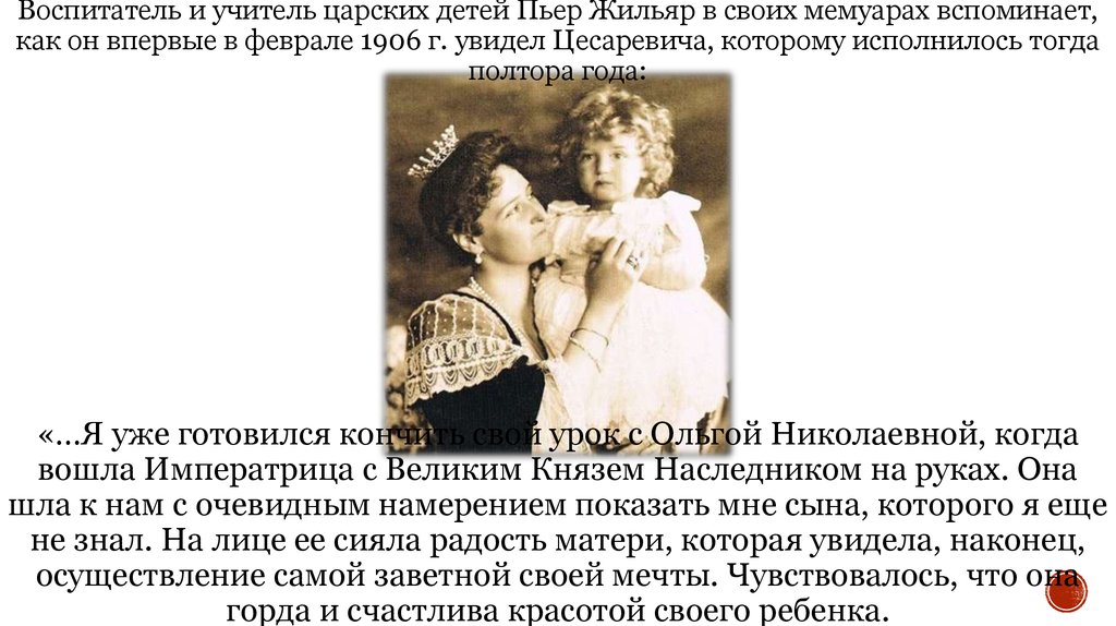 Воспитатель и учитель царских детей Пьер Жильяр в своих мемуарах вспоминает,как он впервые в феврале 1906 г. увидел Цесаревича, которому исполнилось тогда