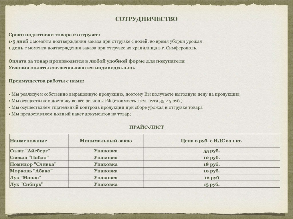 СОТРУДНИЧЕСТВОСроки подготовки товара к отгрузке: