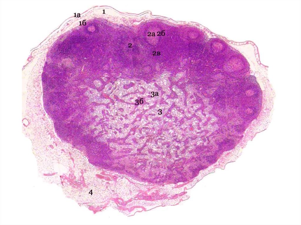 • 1 - приносящиелимфатические сосуды, 2 субкапсулярный (краевой
