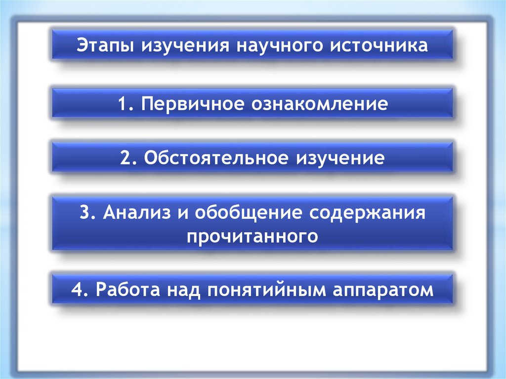 Этапы изучения научного источника1. Первичное ознакомление