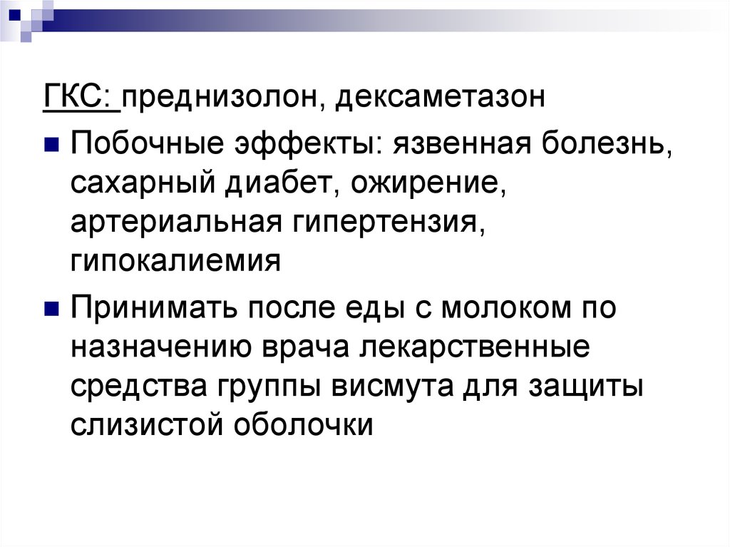 ГКС: преднизолон, дексаметазонПобочные эффекты: язвенная болезнь,