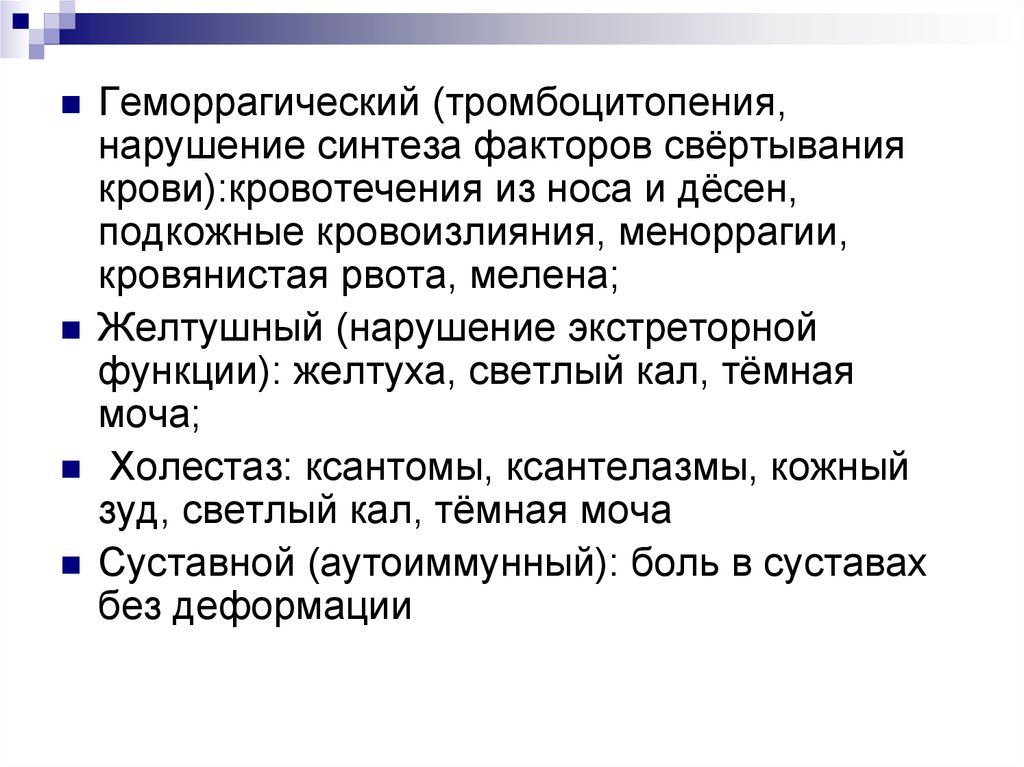 Геморрагический (тромбоцитопения,нарушение синтеза факторов свёртывания
