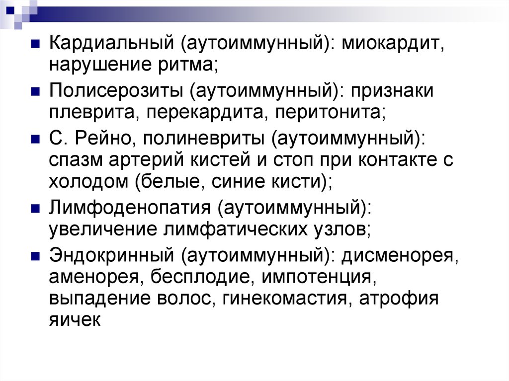 Кардиальный (аутоиммунный): миокардит,нарушение ритма;