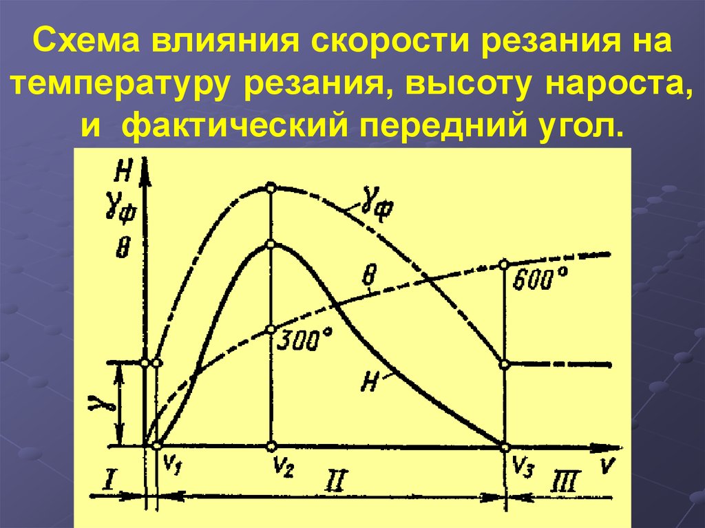 Схема влияния скорости резания натемпературу резания, высоту нароста,