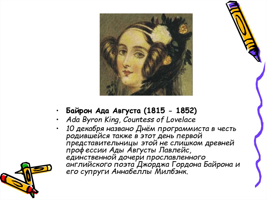 • Байрон Ада Августа (1815 - 1852)• Ada Byron King, Countess of Lovelace