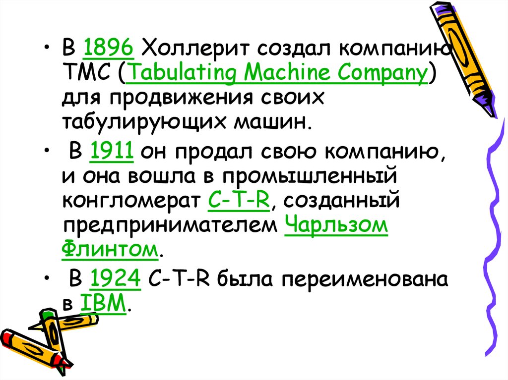 • В 1896 Холлерит создал компаниюTMC (Tabulating Machine Company)