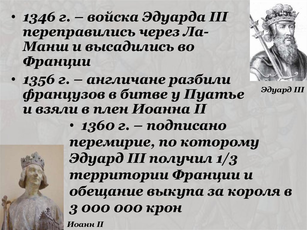 • 1346 г. – войска Эдуарда IIIпереправились через ЛаМанш и высадились во