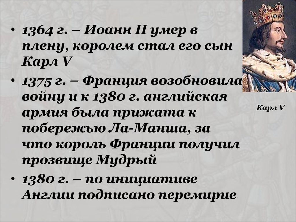 • 1364 г. – Иоанн II умер вплену, королем стал его сын