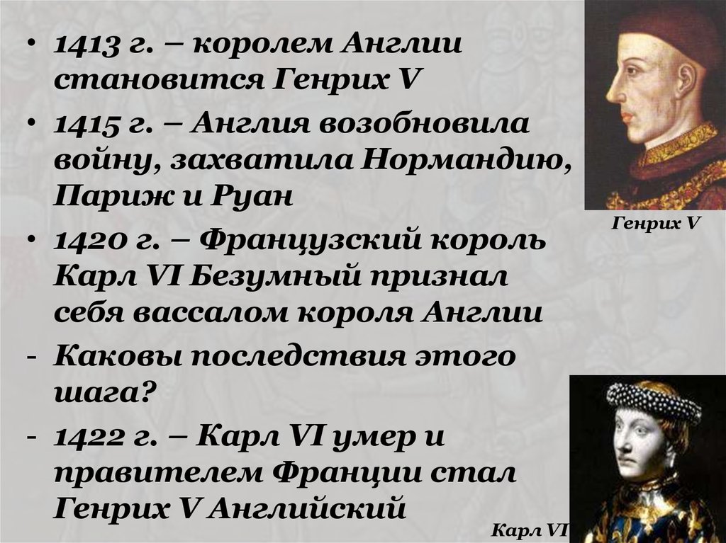 • 1413 г. – королем Англиистановится Генрих V