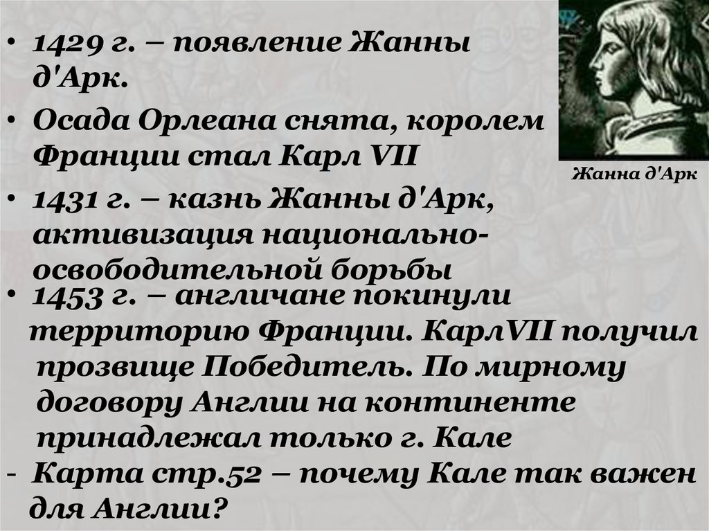 • 1429 г. – появление Жанныд'Арк.