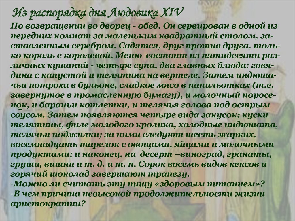 Из распорядка дня Людовика XIVПо возвращении во дворец - обед. Он сервирован в одной из