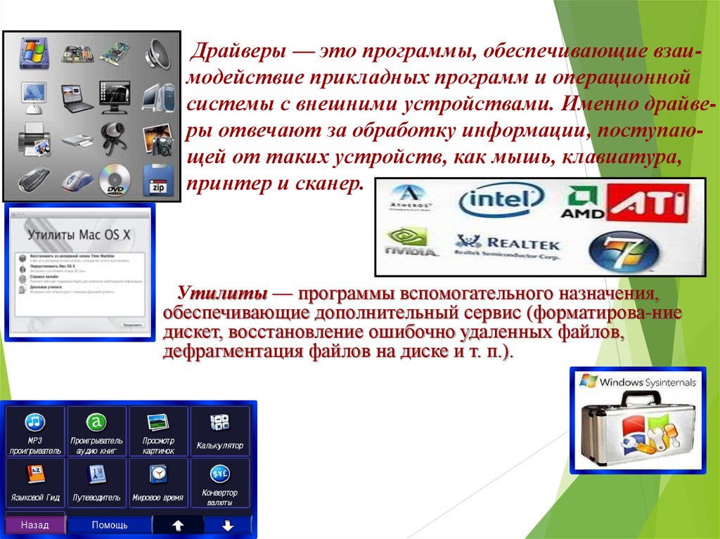 Драйверы — это программы, обеспечивающие взаимодействие прикладных программ и операционнойсистемы с внешними устройствами. Именно драйверы отвечают за обработку информации, поступающей от таких устройств, как мышь, клавиатура,