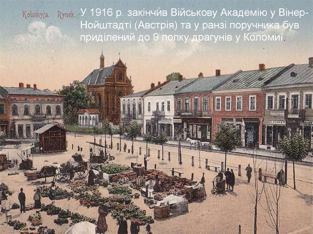 У 1916 р. закінчив Військову Академію у ВінерНойштадті (Австрія) та у ранзі поручника бувприділений до 9 полку драгунів у Коломиї.