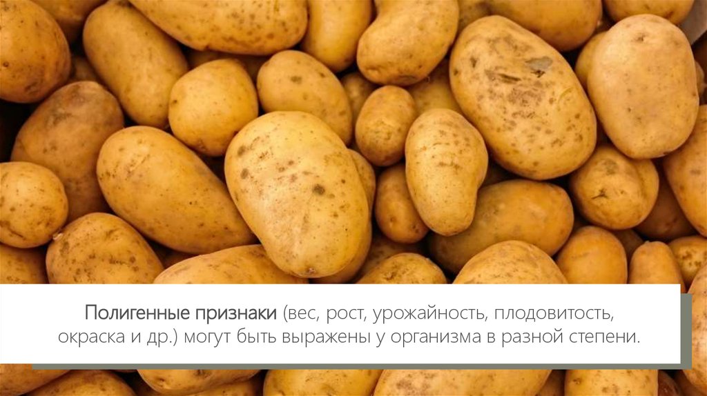 Полигенные признаки (вес, рост, урожайность, плодовитость,окраска и др.) могут быть выражены у организма в разной степени.