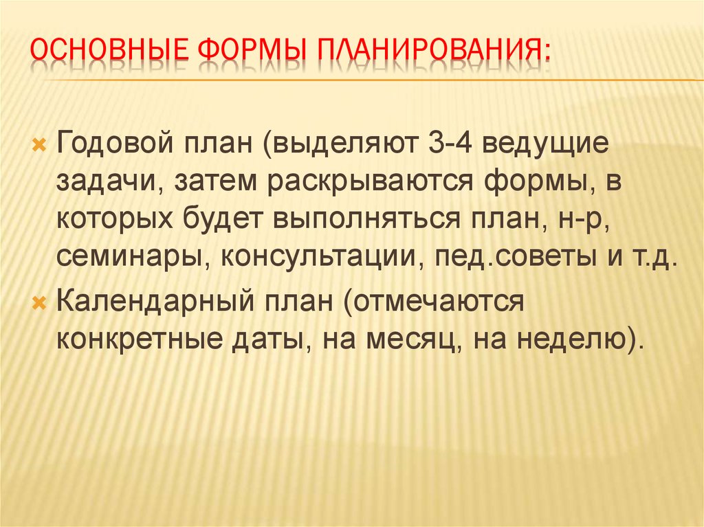ОСНОВНЫЕ ФОРМЫ ПЛАНИРОВАНИЯ:Годовой план (выделяют 3-4 ведущие