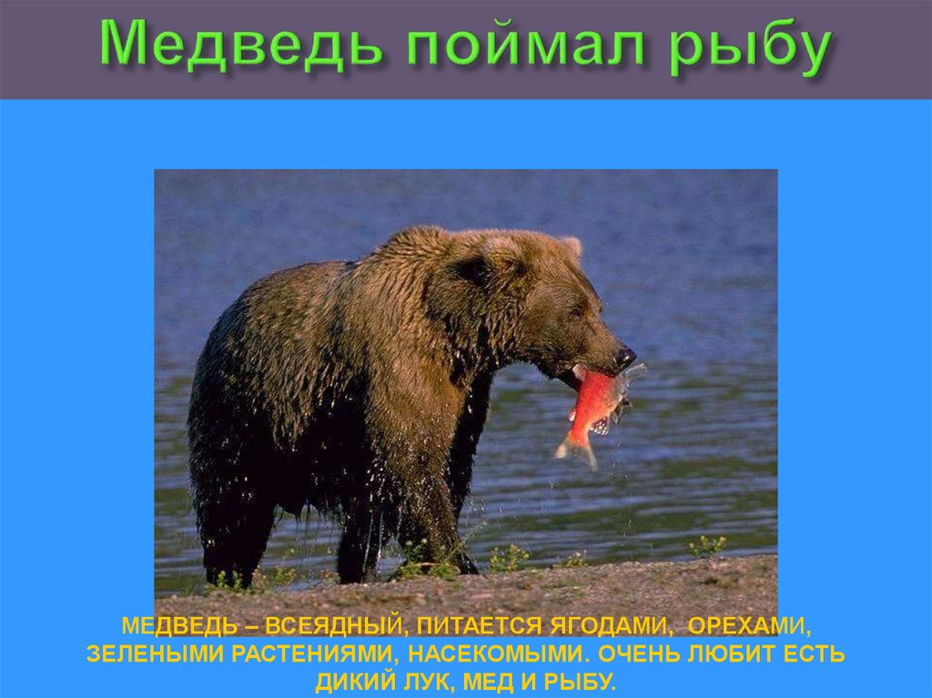 МЕДВЕДЬ – ВСЕЯДНЫЙ, ПИТАЕТСЯ ЯГОДАМИ, ОРЕХАМИ,ЗЕЛЕНЫМИ РАСТЕНИЯМИ, НАСЕКОМЫМИ. ОЧЕНЬ ЛЮБИТ ЕСТЬ
