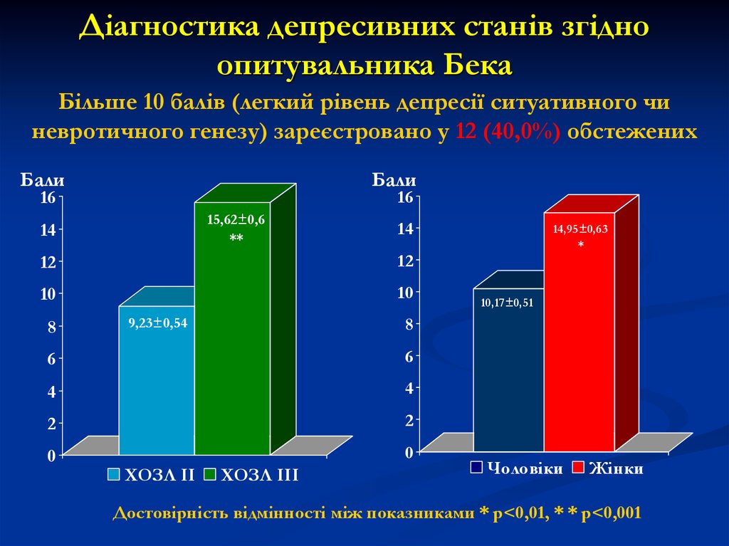 Більше 10 балів (легкий рівень депресії ситуативного чиневротичного генезу) зареєстровано у 12 (40,0%) обстежених