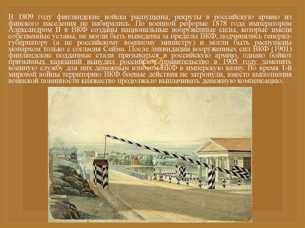 В 1809 году финляндские войска распущены, рекруты в российскую армию изфинского населения не набирались. По военной реформе 1878 года императором