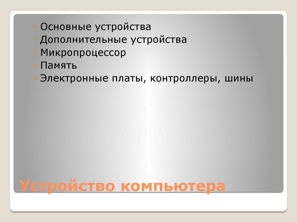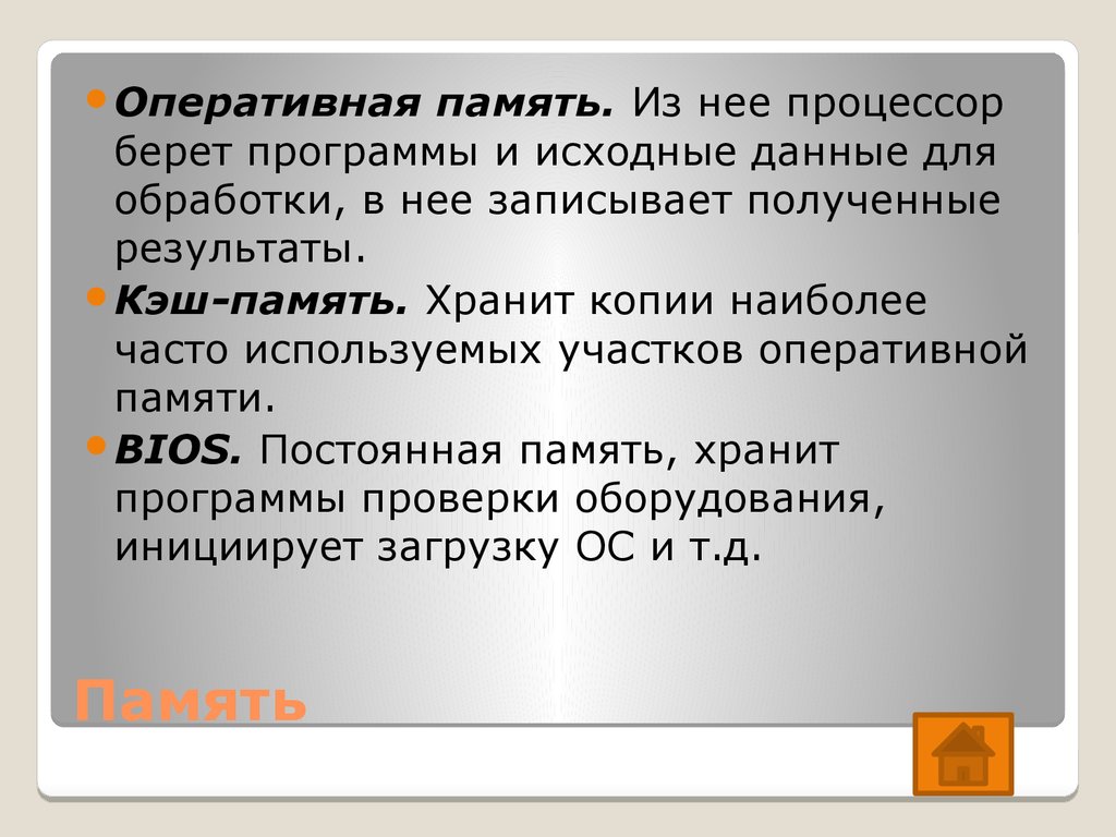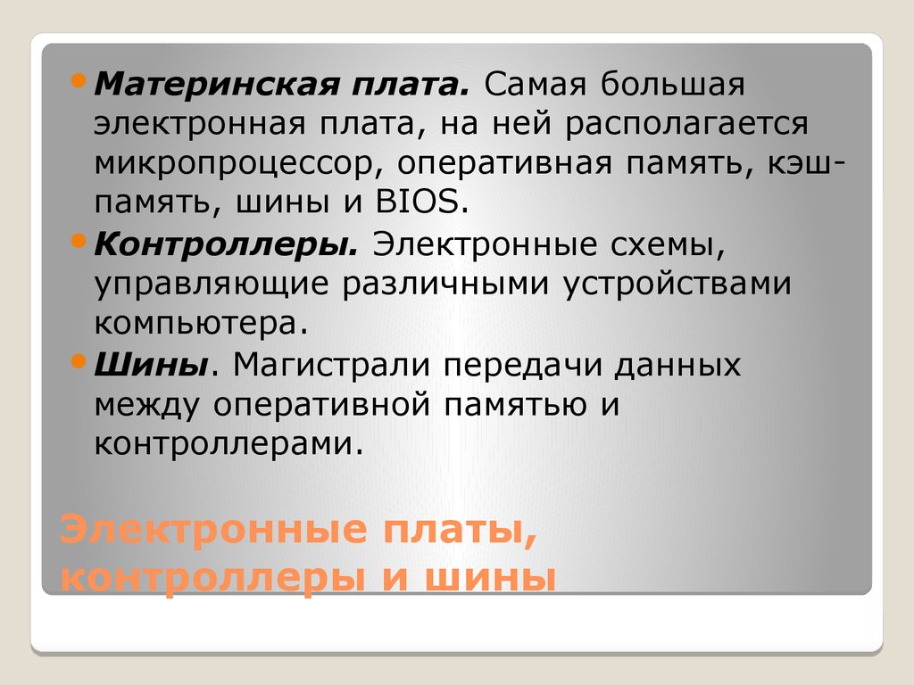 микропроцессор, оперативная память, кэшпамять, шины и BIOS.