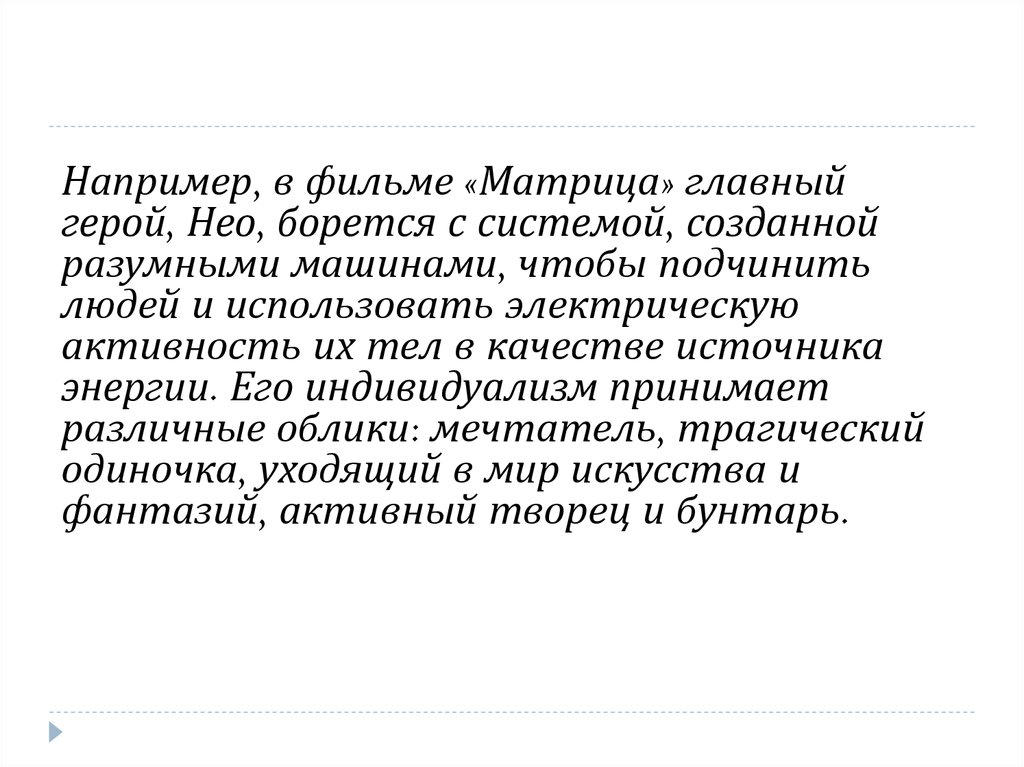 Например, в фильме «Матрица» главныйгерой, Нео, борется с системой, созданной