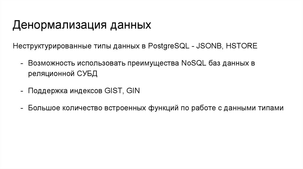 Денормализация данныхНеструктурированные типы данных в PostgreSQL - JSONB, HSTORE