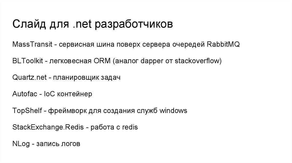 Слайд для .net разработчиковMassTransit - сервисная шина поверх сервера очередей RabbitMQ